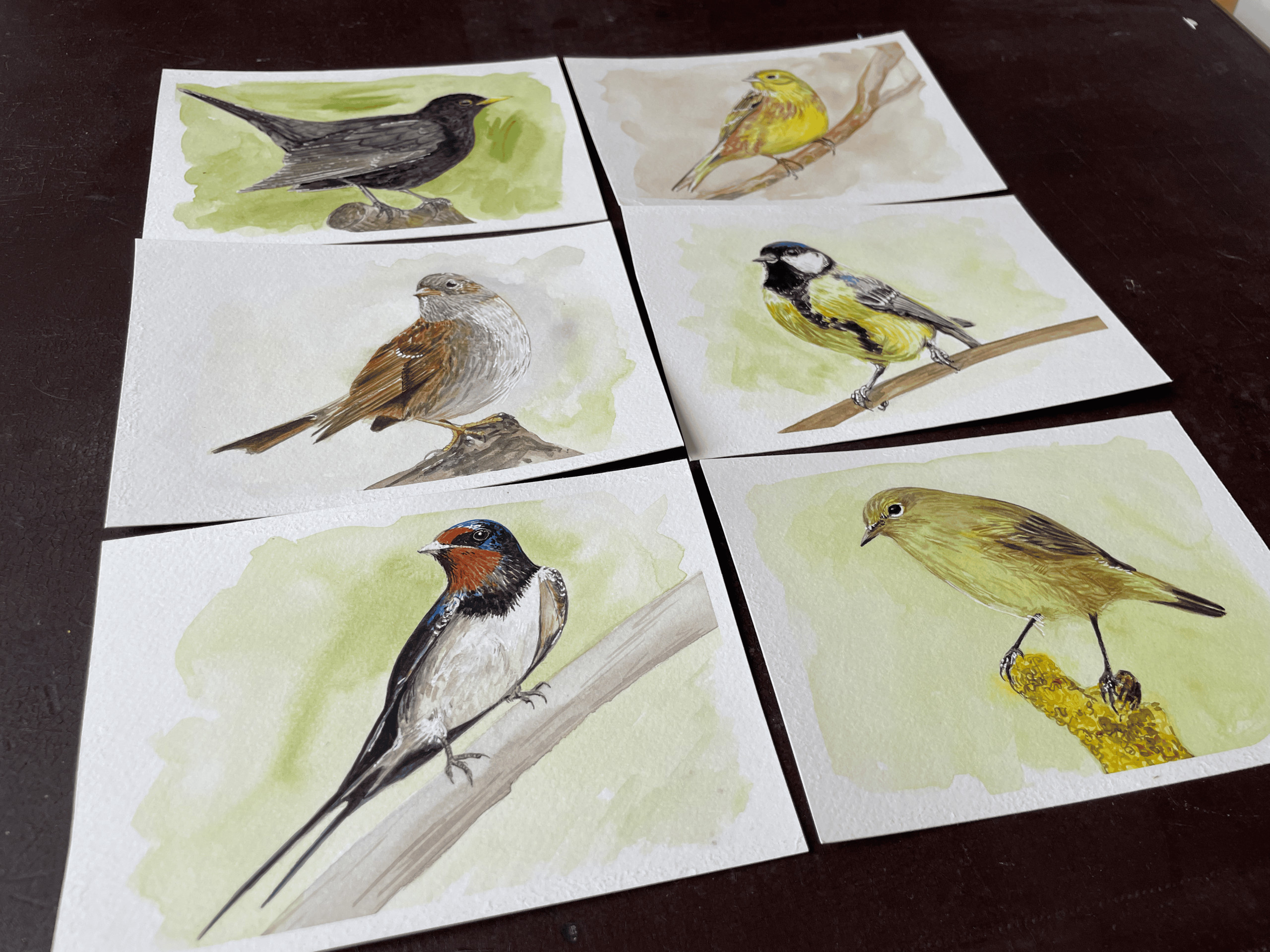 This is a pack of six A7 sized notelets with artwork of small garden birds including, Blackbird, Yellow Hammer, Dunnock, Great Tit, Barn Swallow and Chiffchaff.