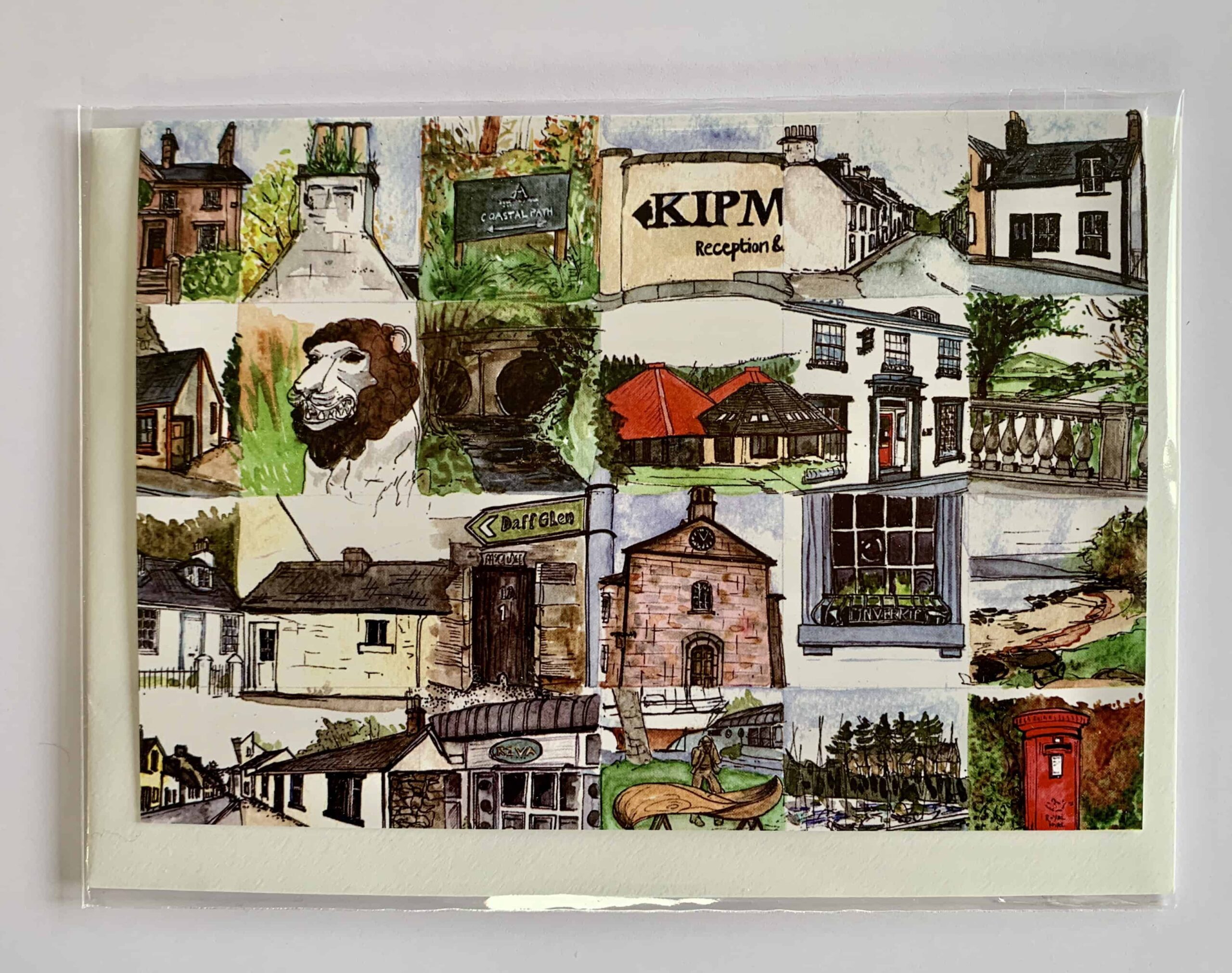 This card is a montage of all the distinctive buildings and features of the Inverkip area. Featuring the Kip Marina, Inverkip Hotel, Inverkip Church, The Chartroom Restaurant and some of the houses in the village. It is blank inside.